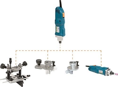 A capacidade “COMBI” permite acoplar-se a diferentes tipos de ca- beçal, podendo assim realizar trabal- hos como tupia, converter-se numa fresadora perfiladora ou inclusivé numa rectificadora.. Os cabeçais estão equipados com tomada de aspiração.