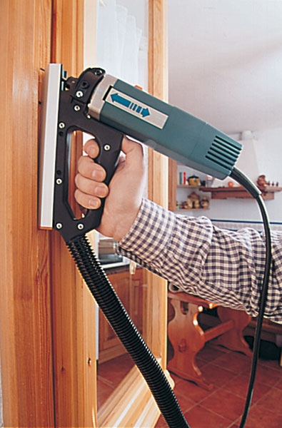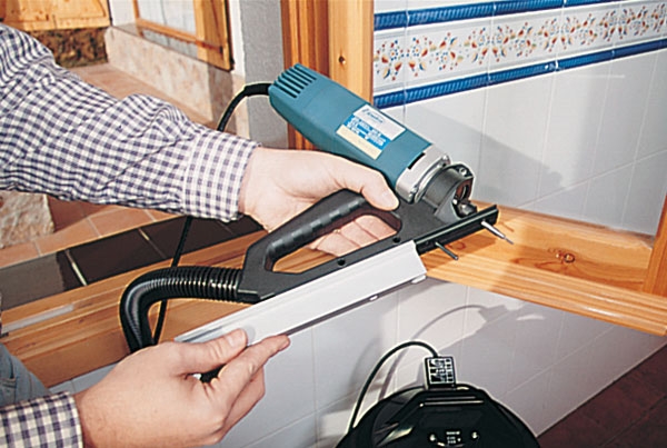 Fresadora ranhuradora para portas e janelas em madeira, para colocação de vedantes. Equipada com fresa dupla 3 mm, 2 bases intermutáveis, esquadro lateral, tubo de aspiração e mala de transporte.